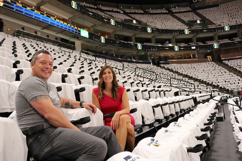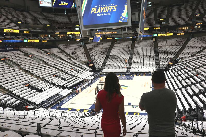 SALT LAKE CITY — It’s five hours until tipoff time, and Jeremy Castro and Meikle LaHue look out over the seats in Vivint Arena. On Saturday night, the arena was decked out in orange and red to match the Utah Jazz’s special City Edition jerseys and court. On Monday afternoon, though, it was a whiteout: Every seat in the arena had a white Jazz shirt draped over it for that night's game.
