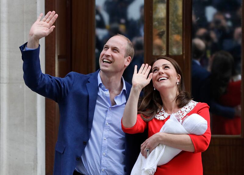 There followed a smoothly choreographed operation perfected after the births of the couple's two other children. In late afternoon, elder siblings Prince George and Princess Charlotte were brought to meet their baby brother. Around 6 p.m. and wearing a vibrant red dress, Kate emerged alongside her husband, holding the tiny royal highness, wrapped in a white lace shawl.