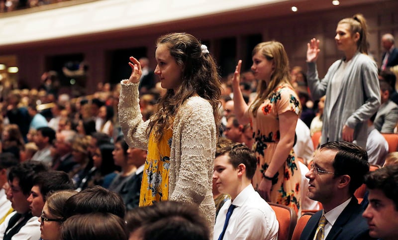 For the first time in 10 years, a general conference congregation met in solemn assembly to sustain a new First Presidency of the Church. The business of the opening session of the 188th Annual General Conference also included the sustaining of the two newest members of the Quorum of the Twelve Apostles, Elder Gerrit W. Gong and Elder Ulisses Soares.