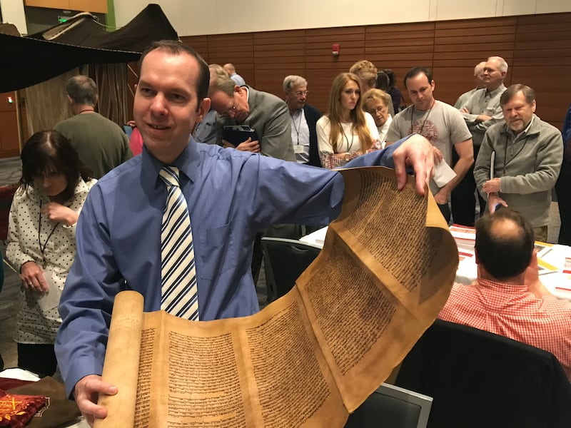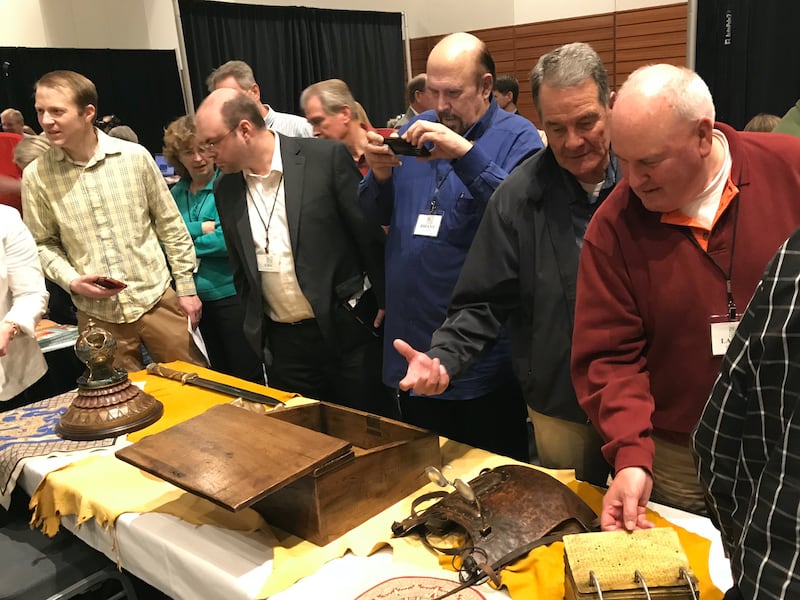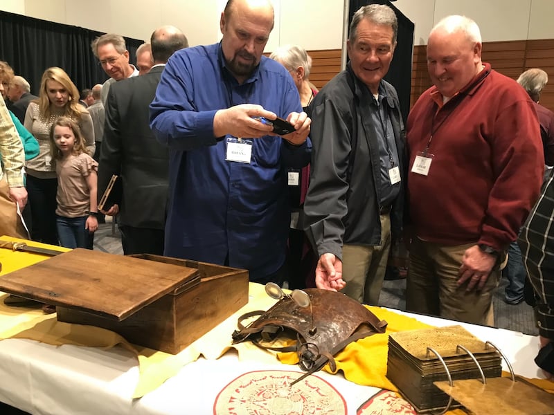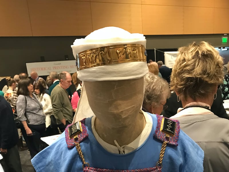 In between presentations, attendees gathered around a table in the display area to see David Baird's replica Book of Mormon artifacts, which he started creating 20 years ago: a recreated Liahona, the sword of Laban, the gold plates and a breastplate with the Urim and Thummim, among others.