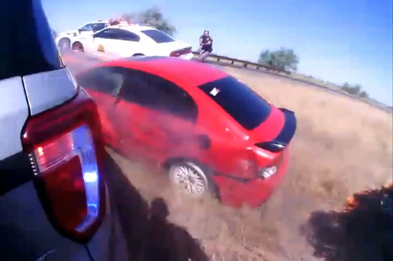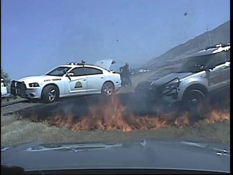 After officers had surrounded the vehicle, video shows the car's wheels spinning as it attempts to drive away, kicking up dirt and sparking a grass fire. A short time later, three officers are shown drawing guns, with another officer equipped with a police dog nearby.