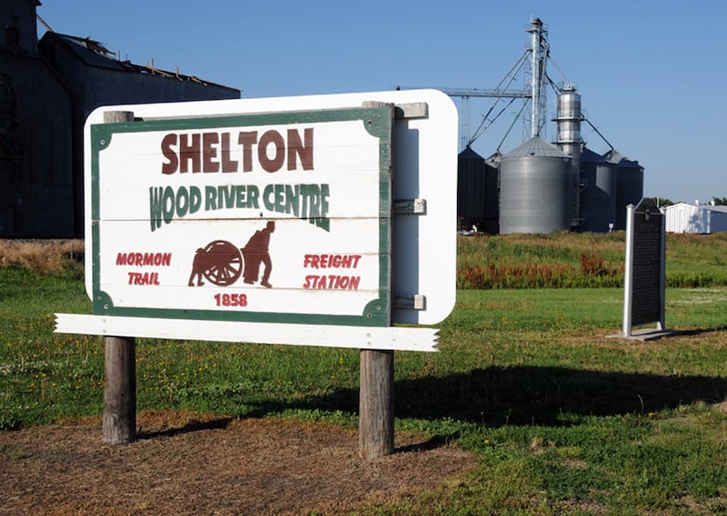 The town site of Wood River in south central Nebraska was named for a tree-lined stream west of Grand Island, Nebraska. A few miles west of Wood River was Wood River Center, now Shelton, Nebraska. Shelton is located about 25 miles west of Grand Island on U.S. Route 30, four miles north of Interstate 80.
