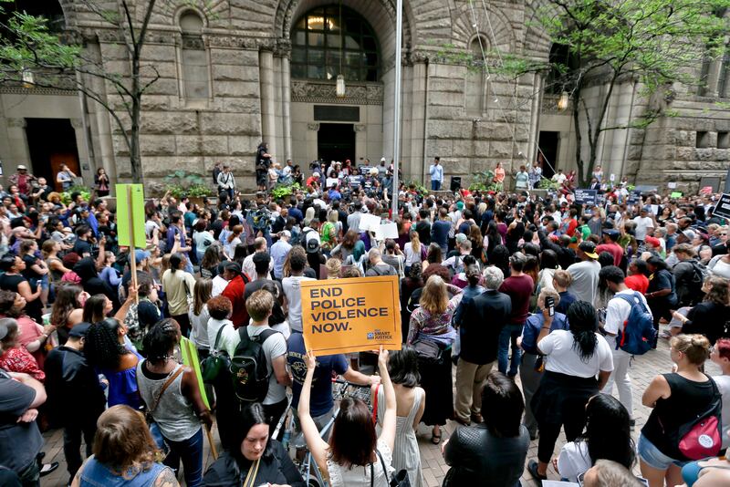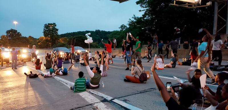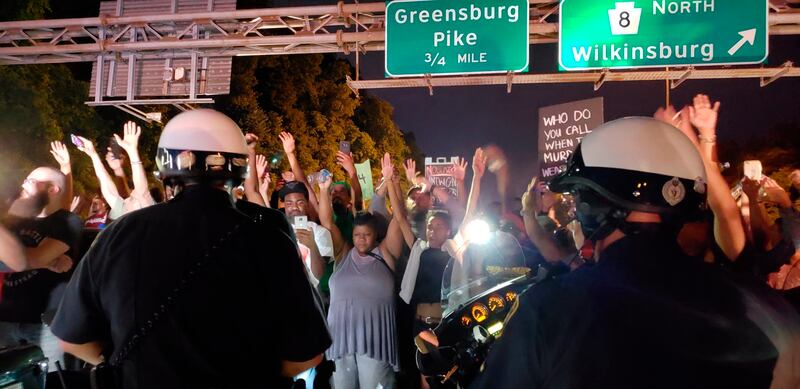 Hundreds of marchers chanting "Who did this? The police did this" shut down a Pittsburgh area highway in the early morning hours, and a small group staged a sit-in outside the district attorney's office later in the day.