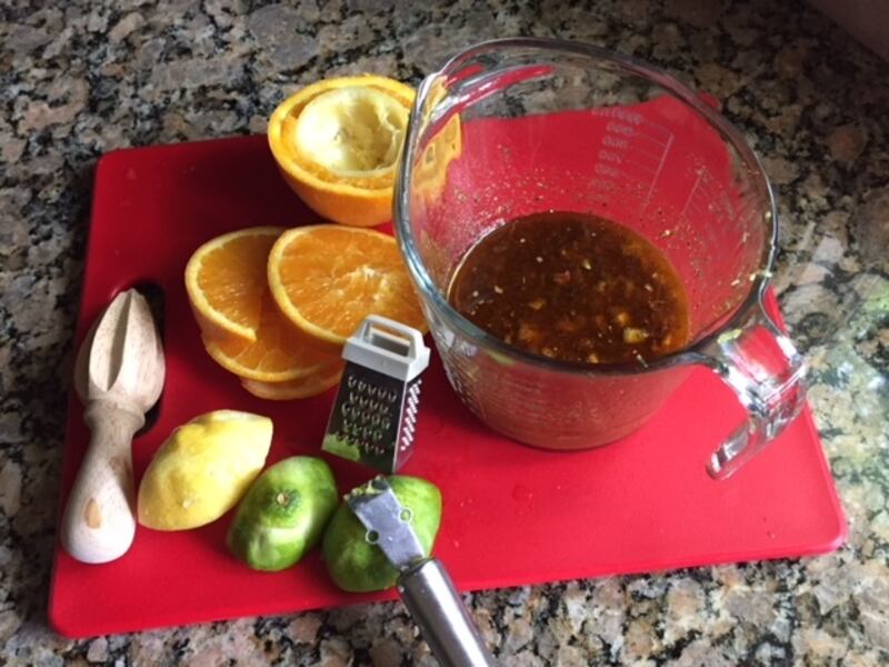Squeeze/juice one half of the orange, whole lime and whole lemon. Put their juices in a small bowl, set aside. Cut the remaining half of orange into slices, set aside. Zest the entire lime and a small amount of the lemon. Add zest to the juices. Stir.