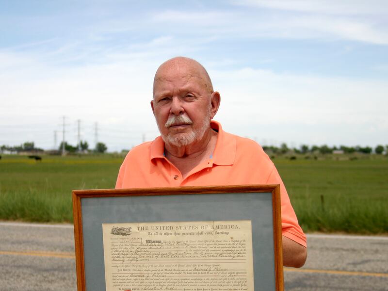 In the photo, Keith Shosted is holding the original deed, issued in 1881 under the Homestead Act of 1862 and signed by U.S. President Chester A. Arthur.