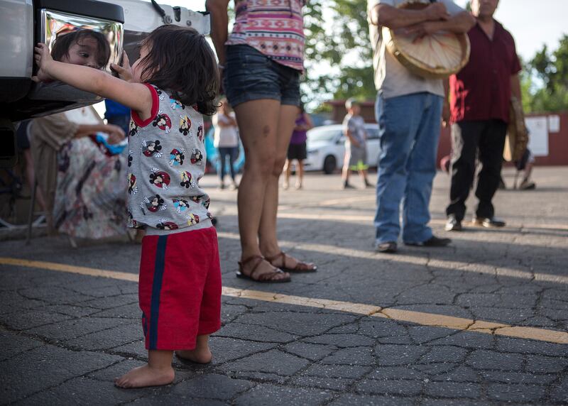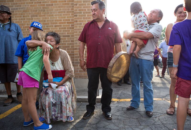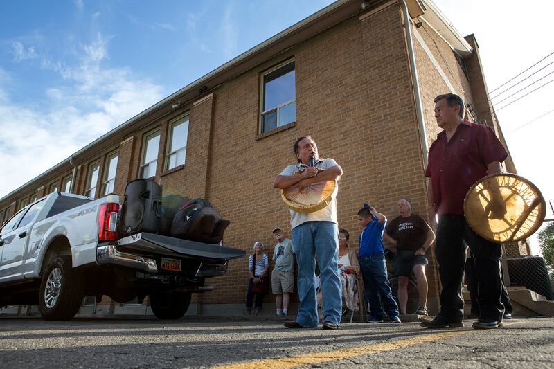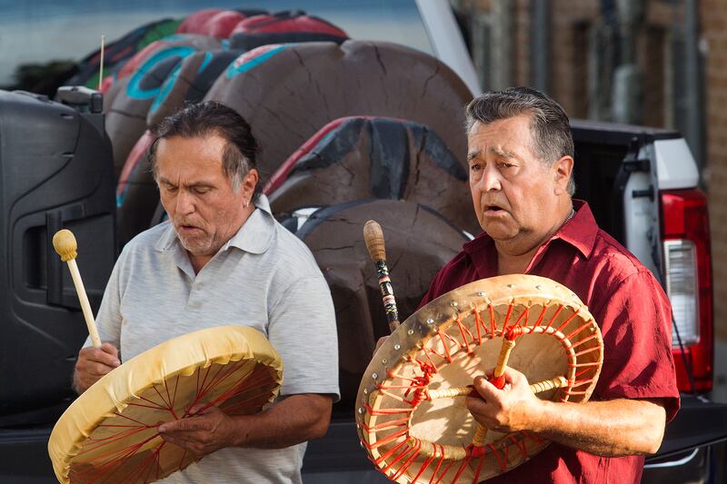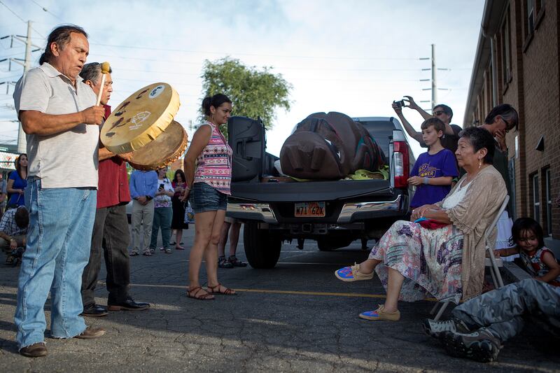 Thursday evening, the smell of smoke hung in the air as the giant bear, which remained at rest in a pick-up truck, was blessed in a reverent ceremony in the center's parking lot. Representatives from a few tribes gave remarks about what the totem symbolizes.