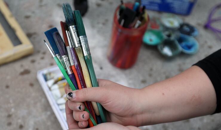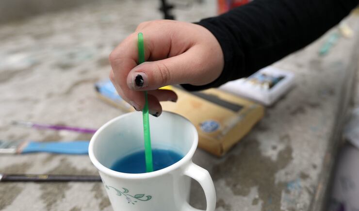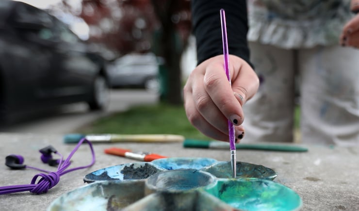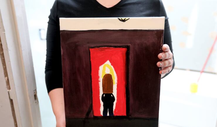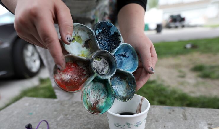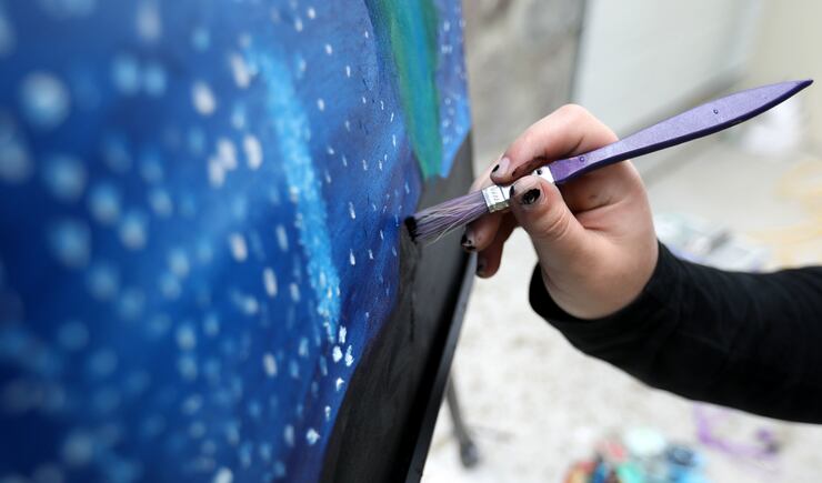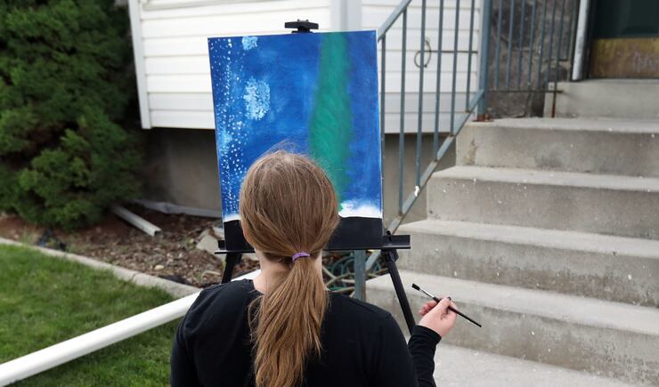 None of that is on Christine’s radar as she sweeps a paintbrush back and forth across her canvas on a recent Friday in Murray, an inky blue sky melting into a shadowy charcoal landscape. She’s careful but her hand moves easily. White stars accent the scene, a blending of northern lights and the Milky Way galaxy.