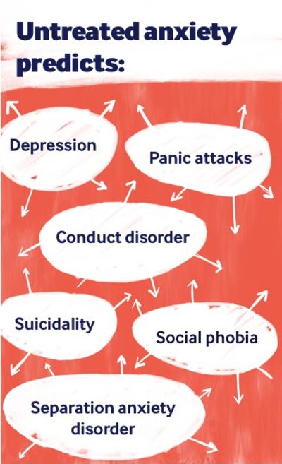 That’s bad news for young people, their families and their futures: Untreated anxiety can play into later panic attacks, depression, separation anxiety disorder, behavioral problems, drug use, social phobias and even suicide.