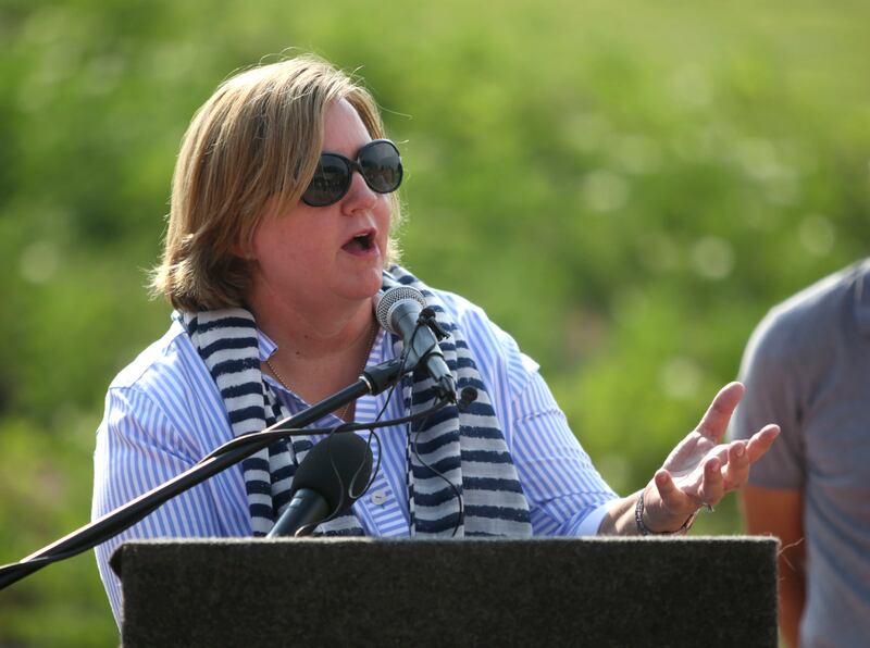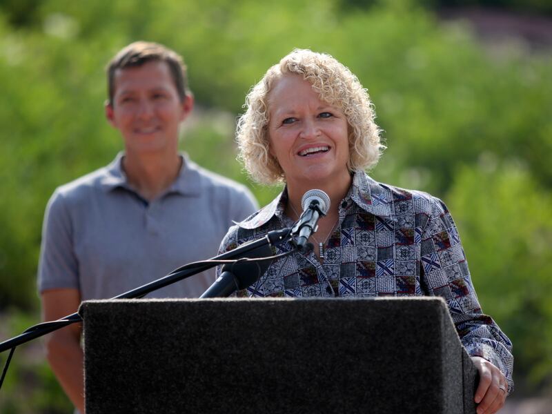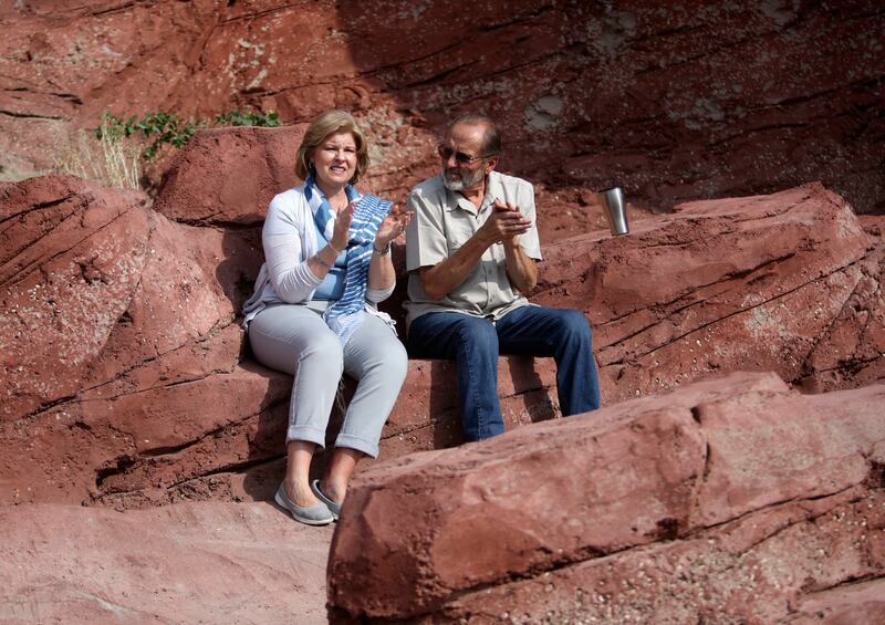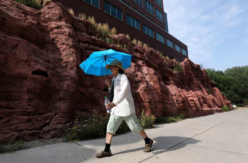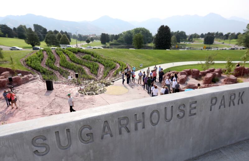 Preston Miller jumps from ledge to ledge on the newly opened Sego Lily Dam environmental art installation, located on the Parleys Bike and Pedestrian Trail at the west end of Sugar House Park, in Salt Lake City on Wednesday. The installation, by environmental architect and landscape designer Patricia Johanson, fuses art, science and engineering technology into what is believed to be the first dam in the world designed as a sculpture. The project features 30-foot high walls that will channel potentially catastrophic floodwaters under 1300 East through a sunken corridor and into Hidden Hollow, where it would continue downstream, eventually making its way to the Jordan River. It is also an amenity on the Parleys Bike and Pedestrian Trail that connects the east and west neighborhoods of the city with the park.