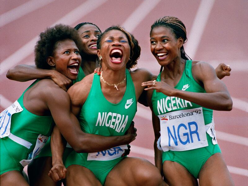 "Pulitzer Prize Photographs" isn't just photos of doom and gloom, though. One photo of hope shows the Nigerian women’s track team at the 1992 Olympics. Photographer Ken Geiger captured the moment the team learned they had taken third, winning the bronze medal.
