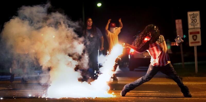 The "Pulitzer Prize Photographs" exhibition displays, as the name suggests, Pulitzer Prize-winning photographs from every year since the committee began awarding the prize to photojournalists in 1942. Eighty photos hang in the exhibition, with still more photos available for museumgoers to view on interactive kiosks. Patrons will recognize iconic photos such as the raising of the flag on Iwo Jima, and more recently, the picture of a Ferguson, Missouri, protester throwing a can of tear gas back at the police.
