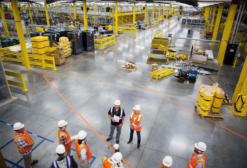 Just a few weeks away from bringing the facility on line, Amazon officials showed off their near-finished warehouse Monday, with hard-hatted, orange-vested city officials in tow.