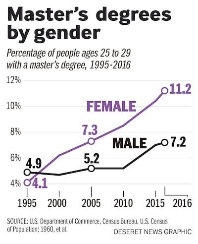For the first time, more than half of all medical school students in 2017 were women, and as of 2016, 11.2 percent of women ages 25 to 29 had a master’s degree or higher, compared to 7.2 percent of men.