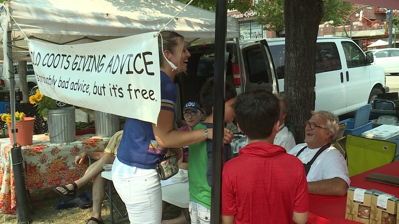 Caputo and his friends sit beneath a banner that reads: "Old Coots Giving Advice." Below that are the words: "It's probably bad advice, but it's free."