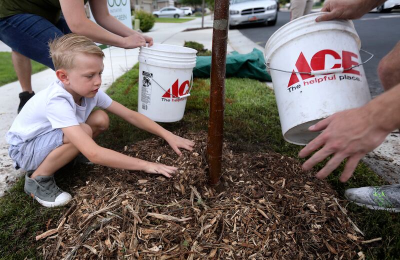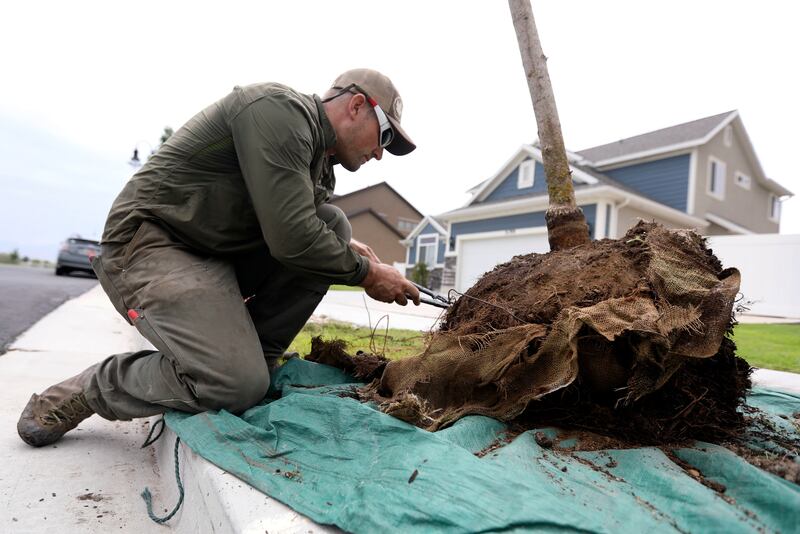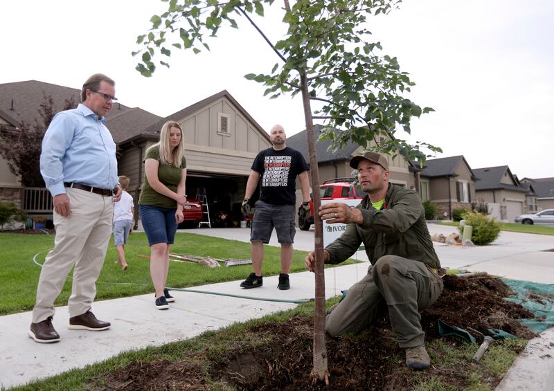 Nicholas Dankers, TreeUtah planting coordinator, helps Darin and Jamie Blanchard plant a linden tree in front of their house in West Valley City on Thursday. After a drunken driver destroyed the tree in front of the house, Ivory Homes gave the Blanchards three new trees as part of its 30,000 tree initiative. Other tree plantings, in partnership with TreeUtah and the Utah Clean Air Partnership, will take place in the coming weeks and months.