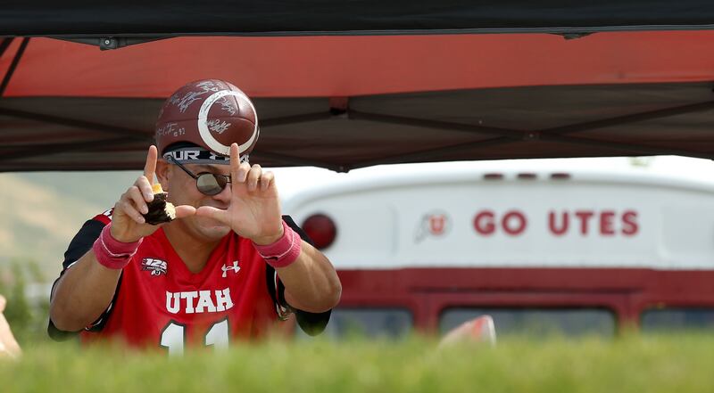 Terri Jackson, a 1976 University of Utah graduate who is fondly nicknamed "Crazy Lady" by her MUSS friends, tailgates before the first Utah home football game in Salt Lake City on Thursday.