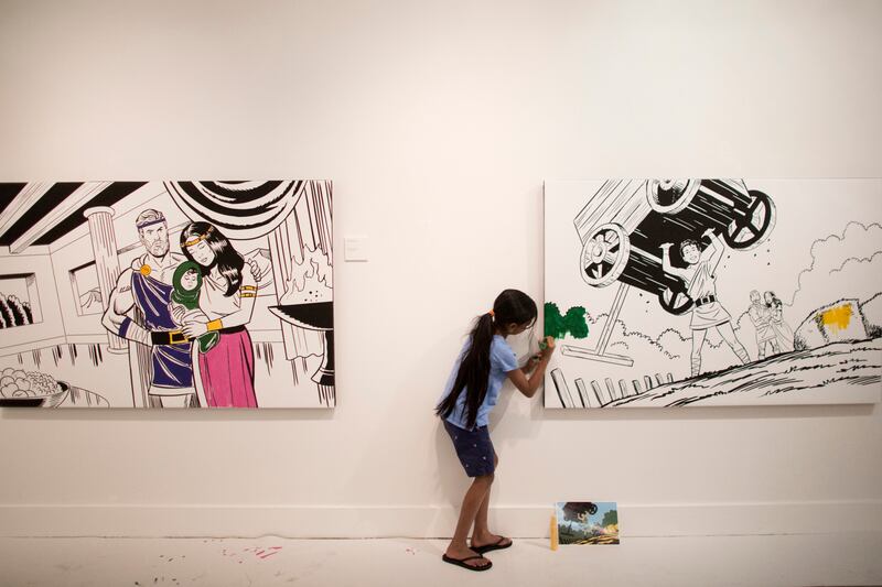 OREM — A new art exhibit in Orem has turned gallery space into a giant coloring book by allowing visitors to fill in the elaborate drawings of comic book style heroes and villains.