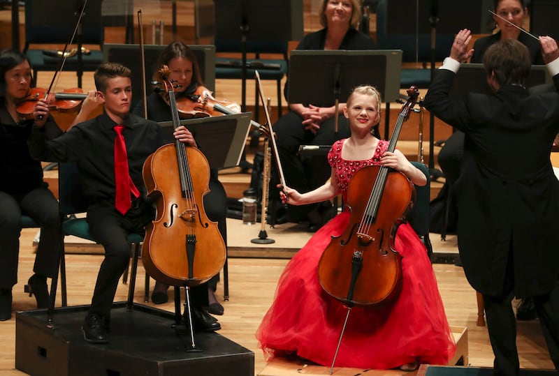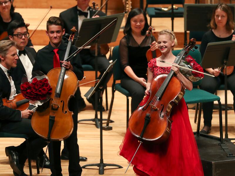 Cellists Nathan Blanchard, 13, and Stella Wadsworth, 14, have their differences — Nathan’s into soccer while Stella prefers pirouettes — but the two came together for a love of music Tuesday night. Nathan, who wore a bright red tie to match Stella’s sparkling red dress, ferociously dug into his strings and leaned competitively toward Stella as they played the third movement of Vivaldi’s Concerto for Two Cellos. Stella seemed to revel in the rivalry, effortlessly playing as she smiled through the whole number and looked at her partner more than she did her instrument.