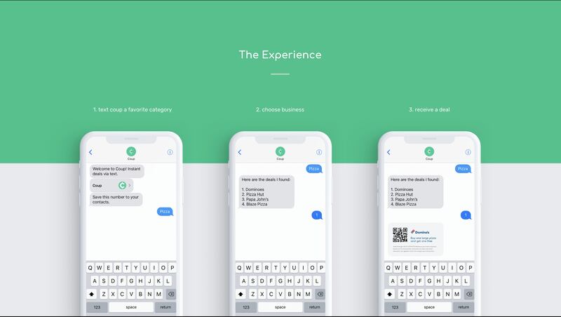 Businesses can get in on Coup's deal-by-text system for as little as $50 per month. Clegg said their discount offerings can be updated, tweaked and/or custom-tailored on the fly, thanks to the technology driving Coup's system.