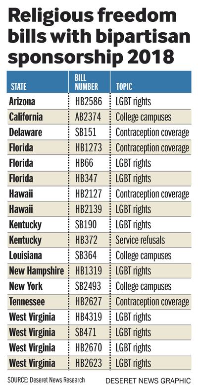But that's apparently not unacceptable for many policymakers, who continue to propose laws that protect LGBTQ people or religious people, not both. State legislatures considered nearly 150 bills related to religious freedom and LGBTQ rights in 2018 and the vast majority were one-sided, according to a recent Deseret News analysis.