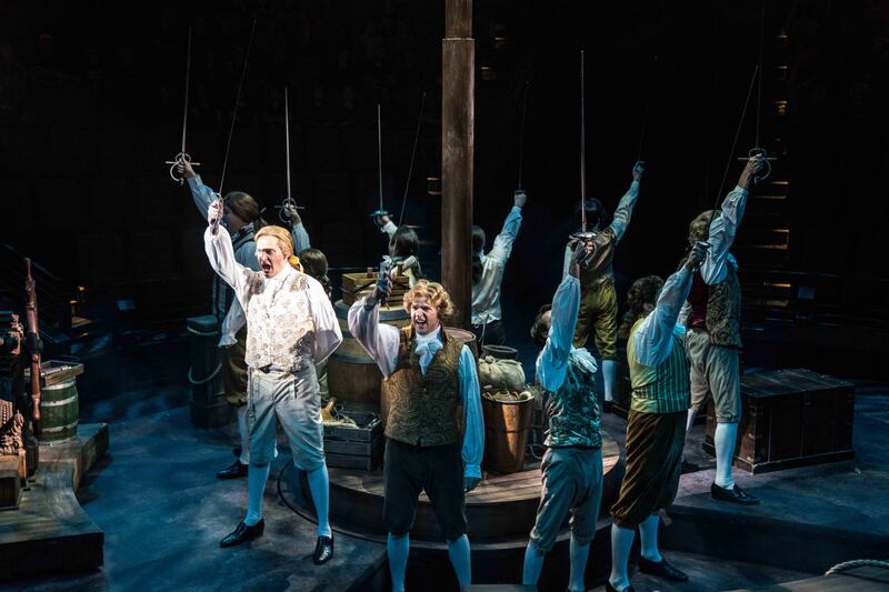 To deflect suspicion, the league’s buffoonish disguises as fashion-obsessed dandies garner the brunt of the laughs, with the song “The Creation of Man” at its comedic epicenter. Yet underneath their powdered wigs — and with a bit of Monty Python-esque flair — the league interrupts the daily beheadings and smuggles poor souls across the channel through the art of distraction: whether dressing in drag or spooking soldiers as Caesar’s ghost.