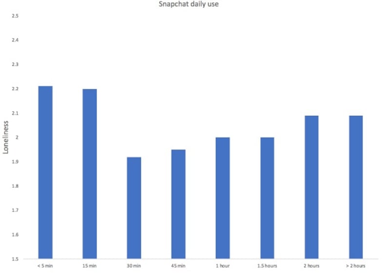 With each platform he tested, there was a specific amount of time used that would result in the least amount of loneliness. Using much more than that, or much less, and the student felt more loneliness. For Snapchat, the magic number was 30 minutes per day. The optimal time spent on Facebook was 45 minutes, with 60 minutes for texting and 90 minutes for Instagram. Pittman said these forms of communication can be fine if people use them to strengthen existing real world relationships, “But once you’re using Instagram for two or three hours a day, then you’re not supporting existing relationships. You’re then usurping or subverting the things you meant to support.”