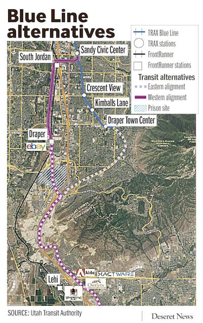 However, planners say there are some good reasons to consider a west side route, that would head south from the Sandy City Station, run through the soon-to-be-redeveloped Draper prison site and then hook east to Lehi.