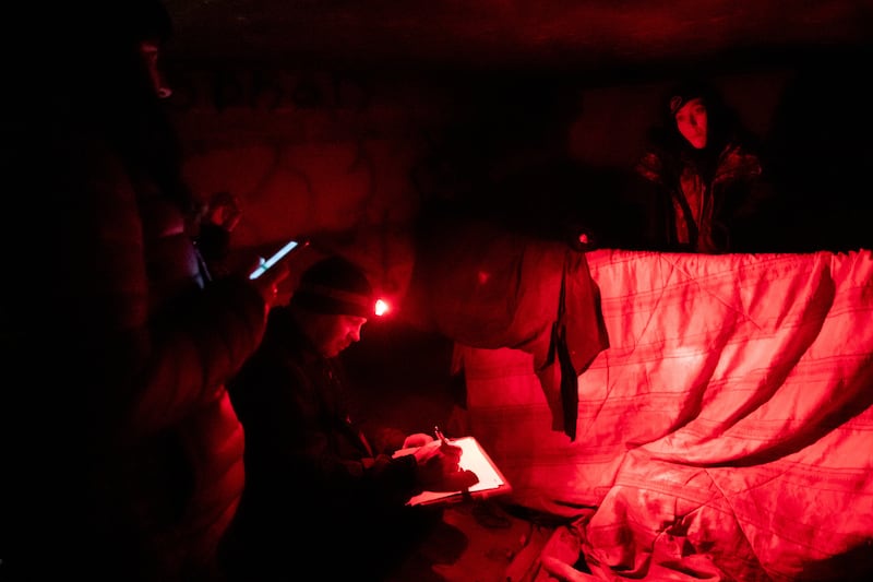 "Oh — hi guys, sorry," Spalding said as his headlamp light flashed in VanValkenburg's eyes. He quickly switched his light from a bright white to a dull red so she could stop shielding her face. She blinked bleary-eyed but smiled.