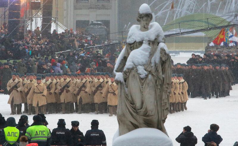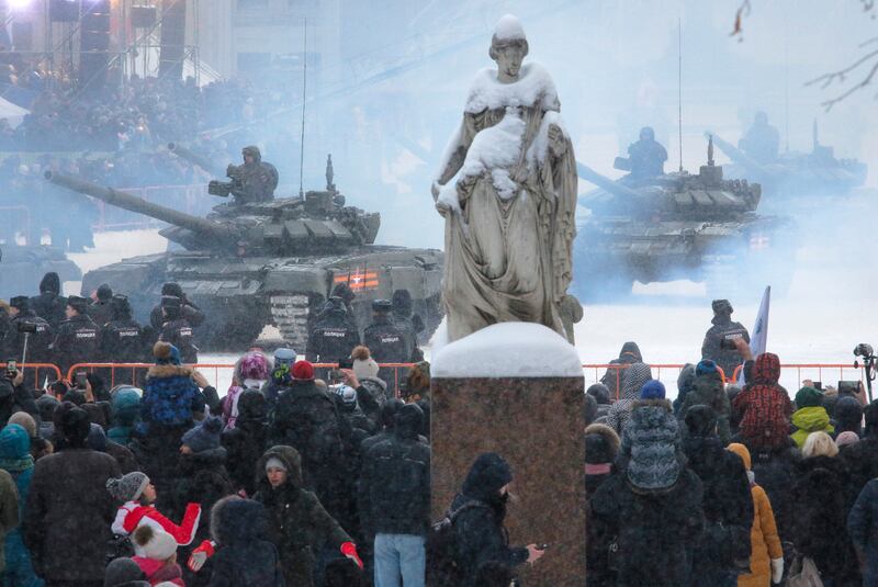 On Sunday, more than 2,500 soldiers and 80 units of military equipment paraded as snow fell and temperatures hovered around minus-18 degrees Celsius (0 Fahrenheit). The vehicles included a T-34 tank; such tanks played a key role in defeating the Nazis and became a widely revered symbol of the nation's wartime valor and suffering.