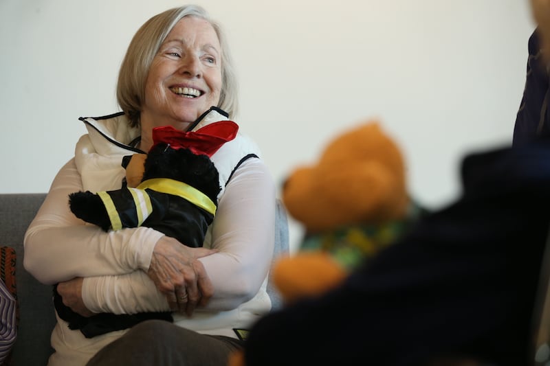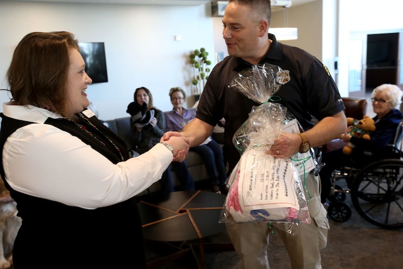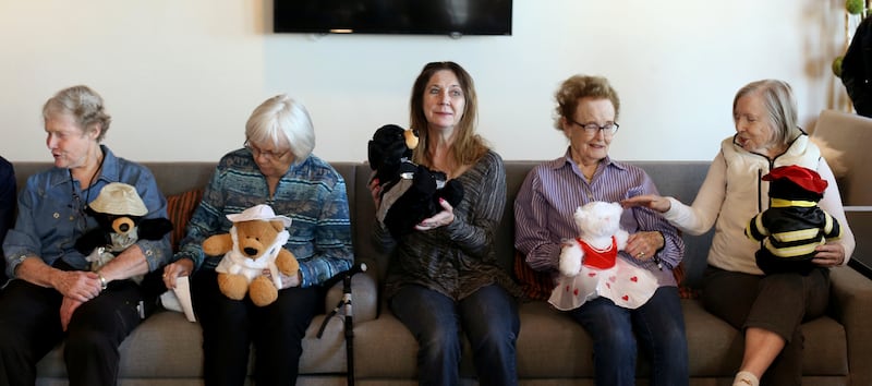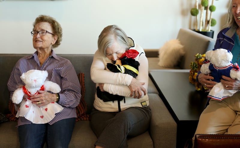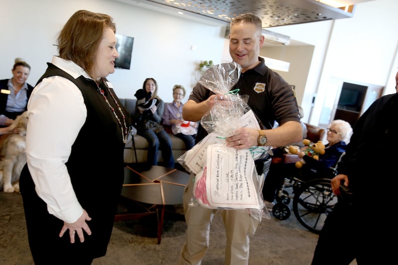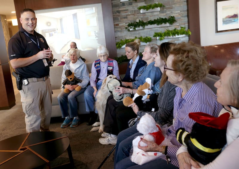 Betty Brewer, left, and Gladys Tucker hold handmade teddy bears before presenting them to Salt Lake City police detective Robert Ungricht at The Ridge Foothill, a retirement community, in Salt Lake City on Wednesday. A team at The Ridge stuffed and dressed the huggable bears as a sign of gratitude for the police department's service and to reach out to the greater community. Police officers often give teddy bears to children who are coping with trauma following accidents.