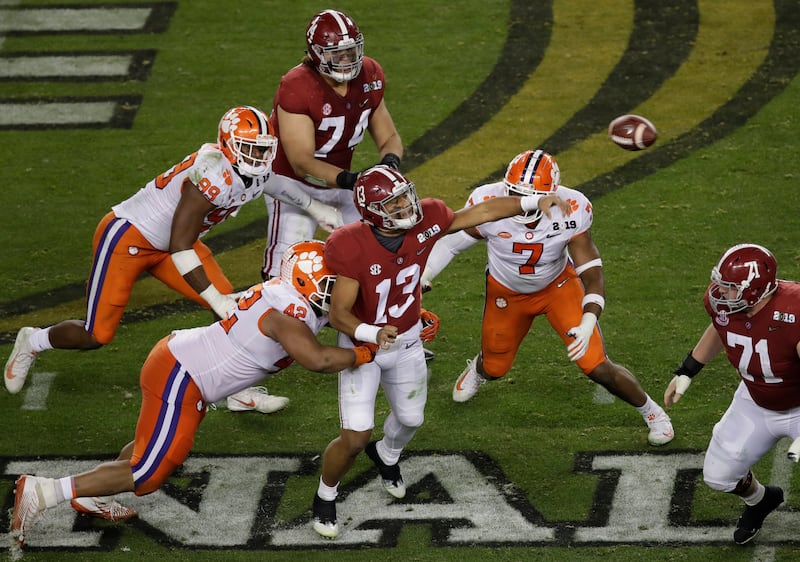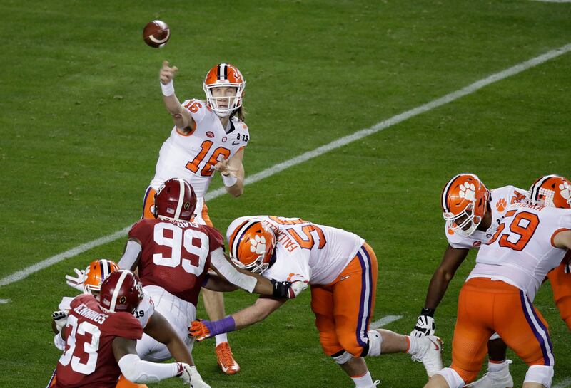 Tagovailoa threw a second interception in the second quarter, this time into triple coverage, and Trayvon Mullen's 46-yard return put Clemson in Alabama territory. That led to Travis Etienne's third touchdown of the half, a 5-yard shovel pass from Lawrence.