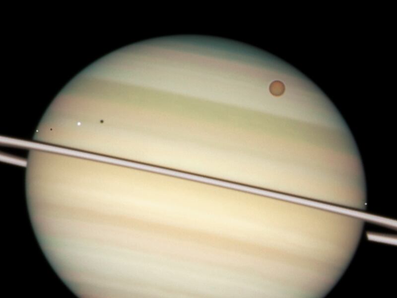 The heat source for the 310-mile diameter moon is gravitational friction with Saturn. In 2008, Cassini flew through gas and water icy plumes at distances ranging from thousands of miles to 120 miles above the surface, finding that “this tiny moon is so active, ‘hot’ and brimming with water vapor and organic chemicals,” wrote a NASA official.