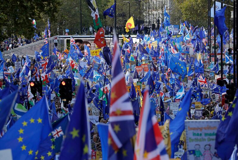 There was drama both inside Parliament and outside, where tens of thousands of anti-Brexit demonstrators marched to Parliament Square, demanding a new referendum on whether Britain should leave the EU or remain. Protesters, many wearing blue berets emblazoned with yellow stars symbolizing the EU flag, poured out of subway trains and buses for the last-ditch effort.