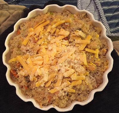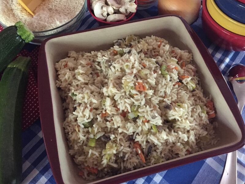 More than three decades have passed and I’ve expanded her recipe, without changing anything in her original four-ingredient version. In the sauté step, I like to add more chopped or diced vegetables, cooked until tender, and then, add in small pieces of chicken, steak or shrimp. This works especially well with leftovers, and this also makes a full meal. Three more steps follow: bring everything to a boil, then, quickly transfer into a baking dish. Cover with a lid (important step!) and bake for 20-25 minutes. Remove from oven and let it just steam for another 5-10 minutes before serving.