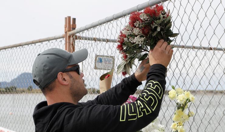 A few locals laid flowers Tuesday at a fence on the waterfront near where the rescue boats had returned with the injured.