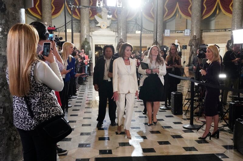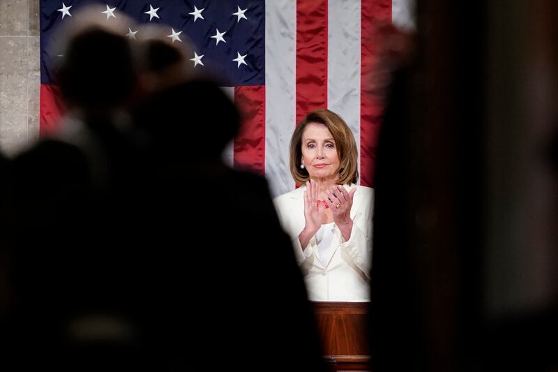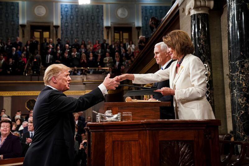 The president was surrounded by symbols of his emboldened political opposition. House Speaker Nancy Pelosi, who was praised by Democrats for her hard-line negotiating during the shutdown, sat behind Trump as he spoke. And several senators running for president were also in the audience, including Sens. Kamala Harris of California and Cory Booker of New Jersey.