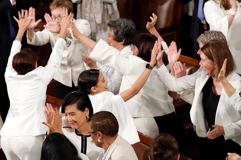 The diverse Democratic caucus, which includes a bevy of women, sat silently for much of Trump's speech. But they leapt to their feet when he noted there are "more women in the workforce than ever before."