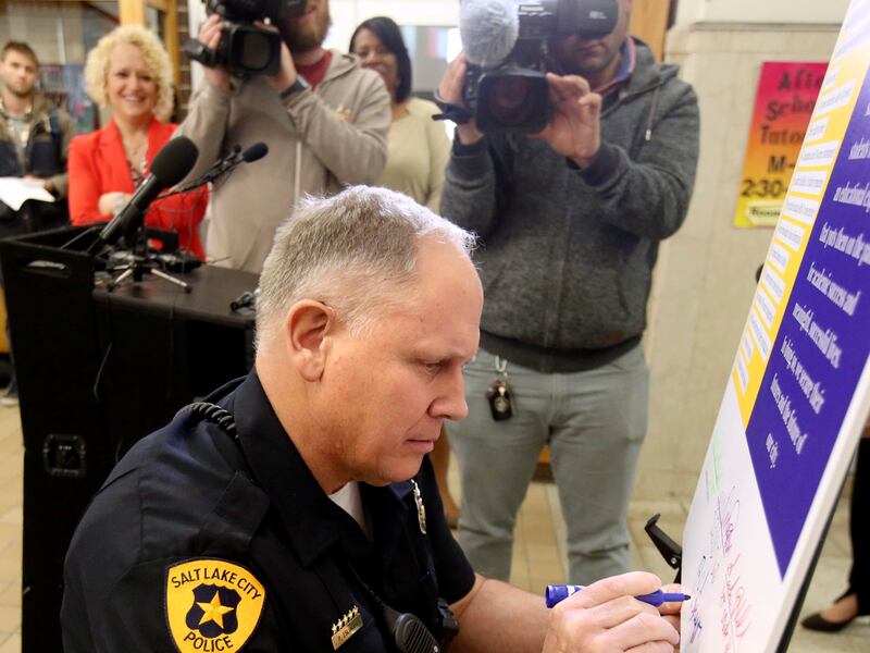 SALT LAKE CITY — Salt Lake City's mayor, superintendent of schools, a state lawmaker and a police sergeant signed an agreement Tuesday that clarifies the roles of school resource officers in the city's schools.