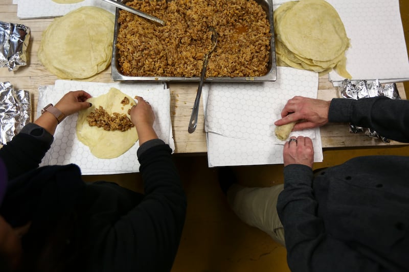 They gathered around tables and spooned beans and rice into homemade flour tortillas. They watched as organizers showed them how to roll the burritos into tin foil wrappers.