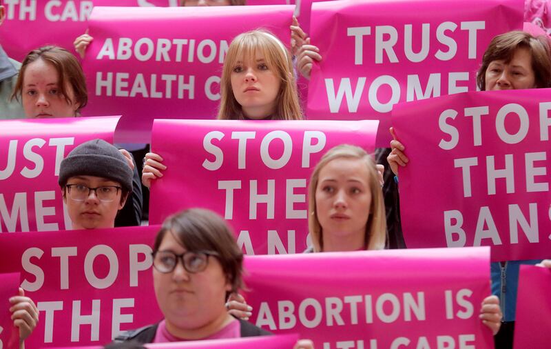 Several dozen women and men stood on the steps leading from the rotunda to the House chambers at the news conference, holding bright pink signs with messages including "Trust Women" and "Abortion Is Health Care."