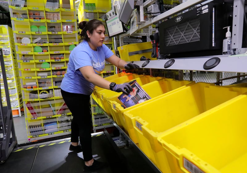 SALT LAKE CITY — While the human workers are isolated at various workstations throughout Amazon's new shipping center, robot-powered bin towers and whirring conveyors dominate a sprawling operation that processes hundreds of thousands of smile-bearing packages every day.