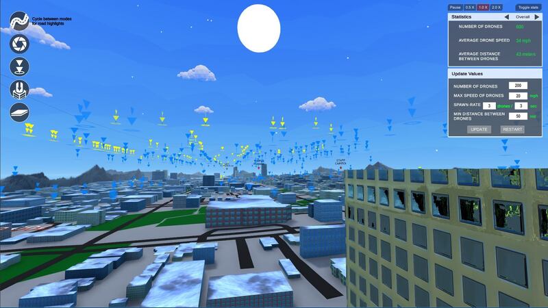 It's likely that once drones are upon us, package- and human-carrying taxi drones will operate in designated corridors — package drones between 400-600 feet and taxis between 600-800 feet. Young said a lot of variable factors are at play when it comes to making the simulator do what it's supposed to.