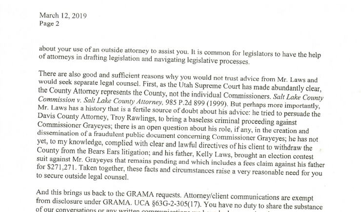 "There is nothing wrong or prohibited about your use of an outside attorney to assist you," Boos wrote them last month, and emphasized that communications between him and the commissioners are exempt from disclosure under Utah's Government Records Access and Management Act.