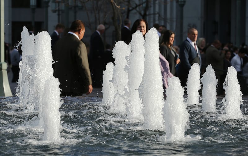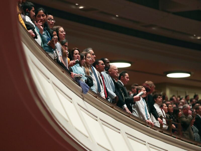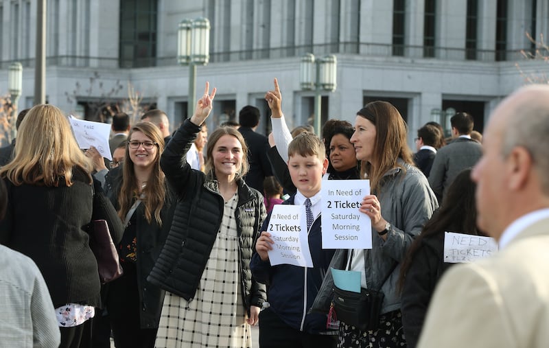 The session began at 10 a.m. The sun worked through clouds all morning to dry wet streets and sidewalks as thousands walked to the Conference Center. Men wore suits, white shirts and ties and women wore spring dresses or skirts. Some wore boots, while some optimistic women wore sandals. Many wore light coats against a pleasant but cool morning, and others stood on corners and asked for extra tickets to the session.