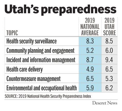 Utah bested national numbers in all but one category, "countermeasure management," which looks at how well the state can store and then distribute needed supplies in crisis. Utah received 5.3, compared to the nation's 6.5.