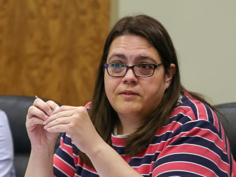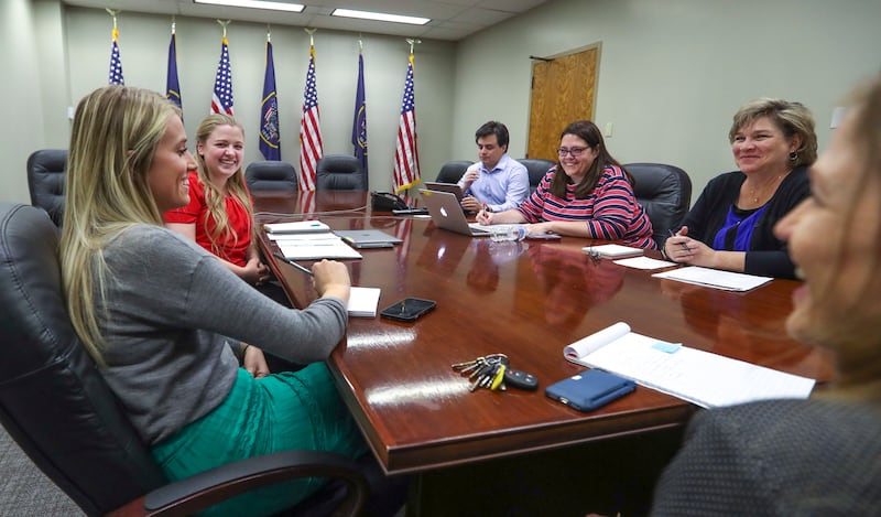 Lee-Romney joint casework director Jessica Christopher takes notes as each member reported the number cases opened, closed and pending in the areas of veterans affairs, immigration, passports and visas, and entitlement programs like Social Security, Medicaid and Medicare. They calendar events they will attend this month to meet new and established contacts the caseworkers work with at various federal agencies.