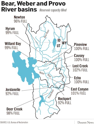SALT LAKE CITY — A trio of northern Utah reservoirs fed by the Weber and Ogden rivers are spilling, and most reservoirs in the state will fill over the next few days as more snow comes off the mountains.