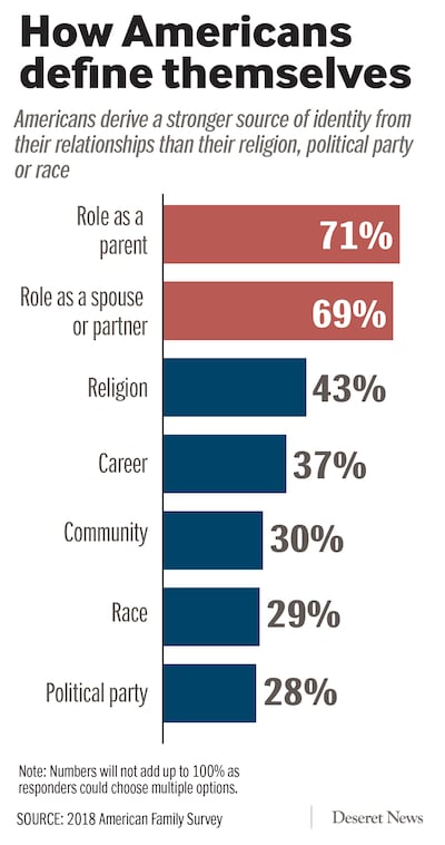 In the 2018 American Family Survey — a nationally representative online poll of 3,000 Americans conducted by YouGov for the Deseret News and the Center for the Study of Elections and Democracy at Brigham Young University — about 70 percent of respondents said their role as a parent was either important or very important, and figured into their identity more than other parts of their life.