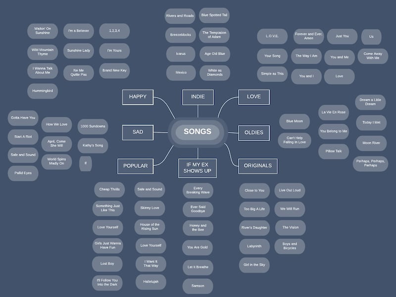 "Playing at coffee shops, it was hard for me to navigate what I wanted to play from my iPad," Thomas said. "I created a mood map with sections and songs that went with them … and a few special case notes, like 'songs for when my ex shows up.'"