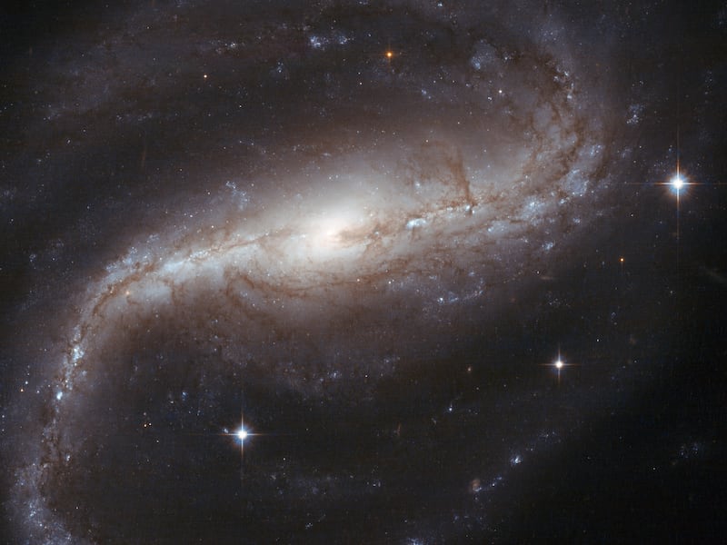 One of these massive bars of stars crossing a spiral galaxy's disk is a sign that the galaxy has reached "full maturity," according to Hubble Space Telescope scientists. One theory is that the interior of the galaxy is rotating slightly faster than the outside, they add.